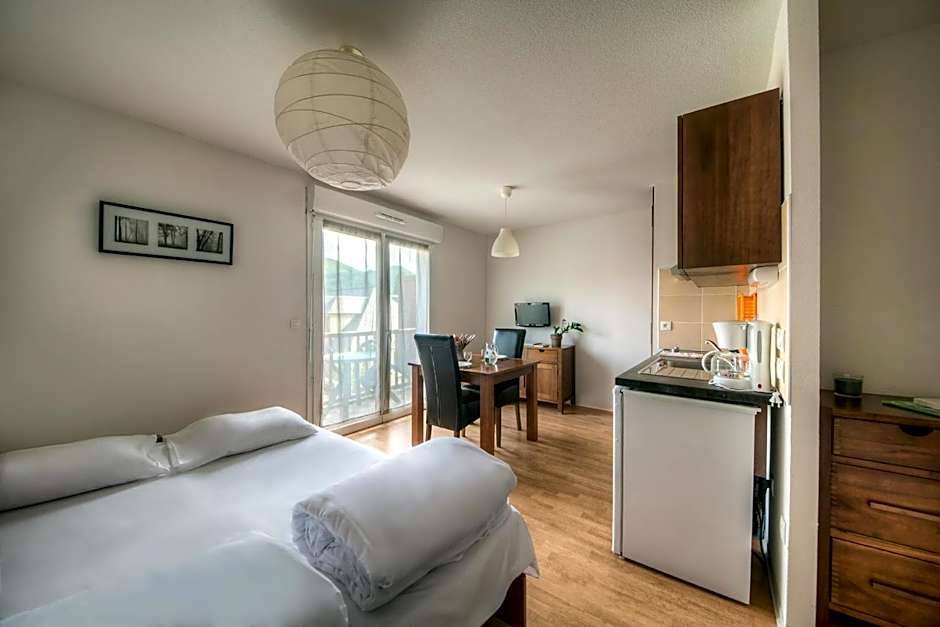 This studio has a double bed, a balcony, kitchen and private bathroom.